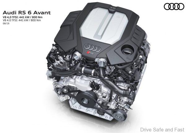 The twin-turbo V8 delivers 441 kW (600 PS) and provides 800 Nm (590.0 lb-ft) of torque consistently within a wide engine speed range from 2,050 to 4,500 rpm. The high-performance Avant takes just 3.6 seconds to complete the sprint from zero to 100 km/h (62.1 mph). And in a mere 12 seconds the Audi RS6 Avant reaches 200 km/h (124.3 mph). The top speed is electronically limited to 250 km/h (155.3 mph); this can be increased to 280 km/h (174 mph) with the dynamic package and even to 305 km/h (189.5 mph) with the dynamic plus package.