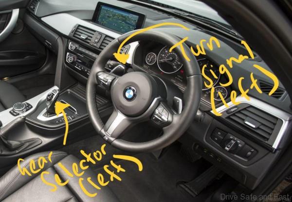 Do you notice a similarity here? Both types of cars follow a mirror image. The driver has one hand that operates the turn signal stalk and another that operates the gear selector.