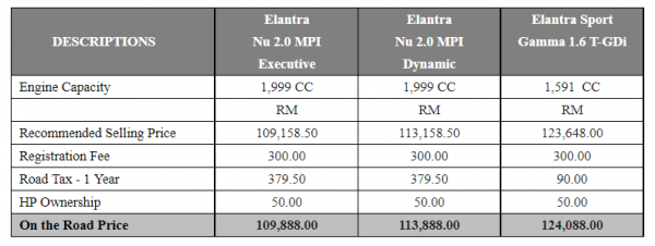 The on-the-road price of the 2.0 Executive variant is RM109,888, while the 2.0 Dynamic is RM113,888 and the Elantra Sport is RM124,088.