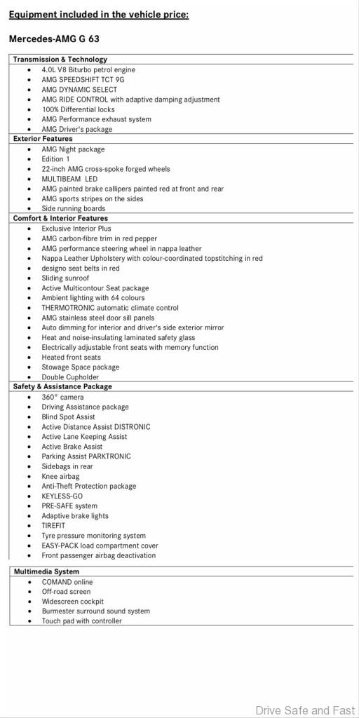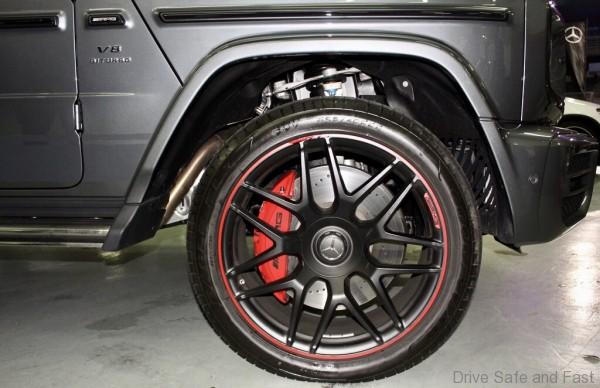 Its unmistakable design features give the new AMG G 63 its unique appearance: the boxy silhouette, the proud bonnet, external door hinges, round headlamps, mounted direction indicators, robust door handles, muscular protective strips with inserts in high-gloss black with a silver AMG emblem, the exposed spare wheel on the rear door with a stainless steel cover and three-pointed star. The front section of the G 63 is characterised by the AMG-specific radiator grille and the AMG bumper with large side air inlets and trim in matt iridium silver. The headlamps, indicators and tail lights are in LED High Performance technology as standard. This lighting consumes less energy and has a particularly long service life.