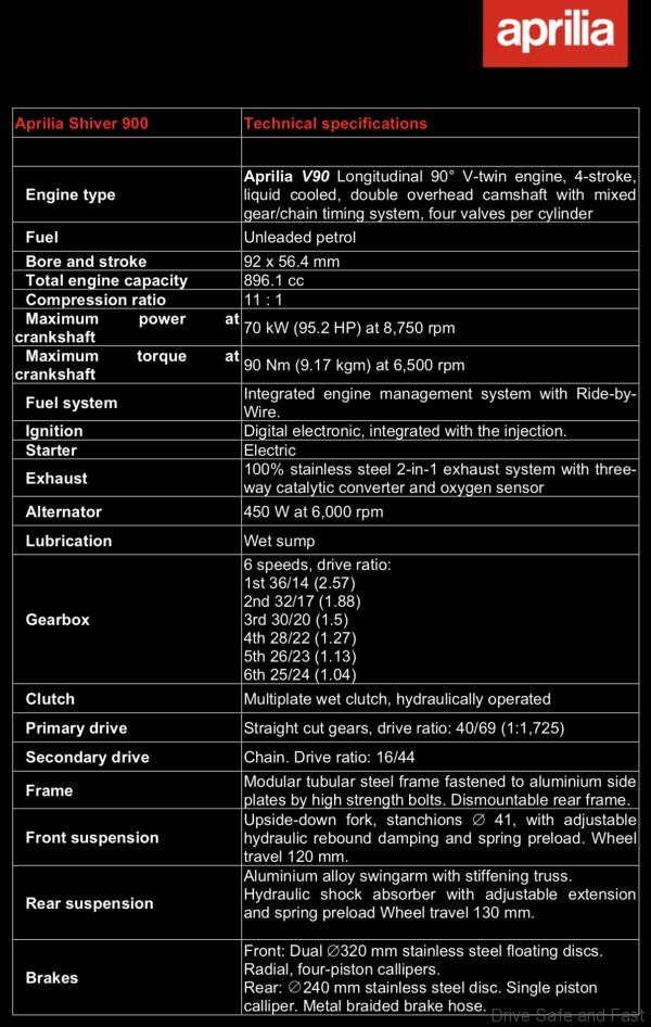 This Shiver is powered by a Euro 4-compliant 900cc V-twin engine which puts out 90Nm of torque at 6500rpm and 70kW of power at 8750rpm. It can be configured to limit its output to 35kW for those holding A2 driver’s license. This makes the Shiver 900 an easy bike to ride even for relatively inexperienced bikers.
