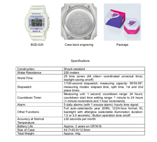 The BGD-525 announced today is a 25th anniversary model of the BABY-G that sparked a new trend and turned digital watches into fashion accessories. In addition to a semi- transparent case and band, it comes with a simple square form signifying toughness and a protector that symbolizes strong shock resistance, plus a pink “G” logo.