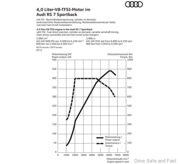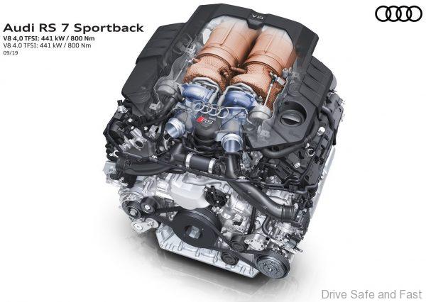 The 4.0 TFSI in the new Audi RS7 Sportback produces 441 kW (600 metric hp) and delivers 800 Nm (590 lb-ft) of torque within a broad range from 2,050 to 4,500 rpm. The high-performance Sportback will sprint from 0 to 100 km/h (0 to 62.1 mph) in only 3.6 seconds. The top speed is electronically limited to 250 km/h (155.3 mph); this can be increased to 280 km/h (174 mph) with the Dynamic package and to 305 km/h (189.5 mph) with the Dynamic plus package.