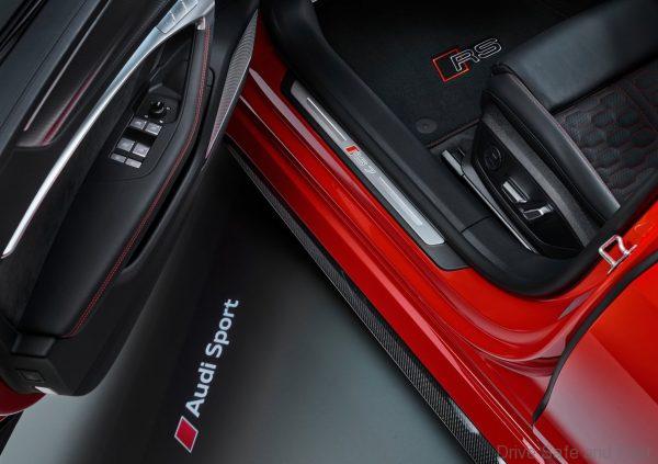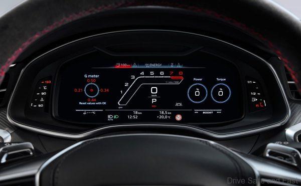 Special RS displays use the Audi virtual cockpit to provide details of tire pressure, torque, performance, oil temperature, boost pressure, lap times, acceleration, and g-forces. The shift light display prompts the driver to upshift when the rev limit is reached. The optional mild hybrid system (MHEV) also shows some RS-specific information.