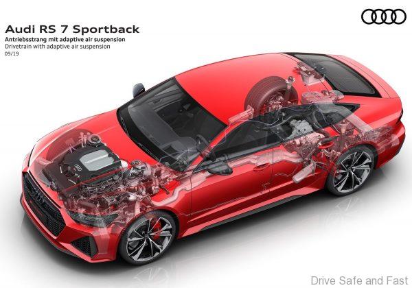 Five-link front and rear axles handle the lateral and longitudinal forces independently on the new RS7 Sportback. The linkages and the subframes are made largely of aluminum. The track is 1,668 millimeters (65.7 in) at the front and 1,650 millimeters (65 in) at the rear.