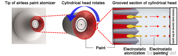 Conventional air paint atomizer sprayed paint primarily using aerodynamic force, then paint the vehicle body with the atomized particles using an air paint atomizer. For this reason, paint particles are scattered by the air ricocheting off the vehicle body, resulting in a coating efficiency of approximately 60 to 70 percent. By comparison, the new airless paint atomizer uses electricity to sprayed the paint (electrostatic atomization), and the statically charged particles coat in such a way that they gravitate toward the vehicle body (electrostatic painting). Electrostatic atomization and electrostatic painting technologies greatly reduce the number of atomized particles that scatter, thereby achieving a higher coating efficiency.