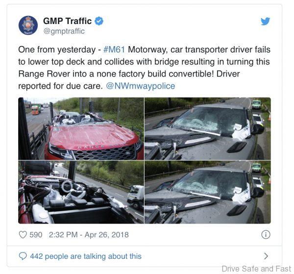 Over the weekend, Greater Manchester Police Traffic Twitter account reported that a car carrier trailer loaded with several Range Rover SUVs had smashed into a bridge on the M61 highway. The incident apparently happened as the driver had forgotten to lower down the upper deck after his last delivery. The driver says he got absent minded after a woman with a pram asked him to move his truck and that cause him to miss out on his regular safety procedure. The police have proceeded to report him for driving without due care according to their Tweet.