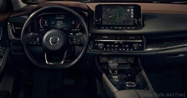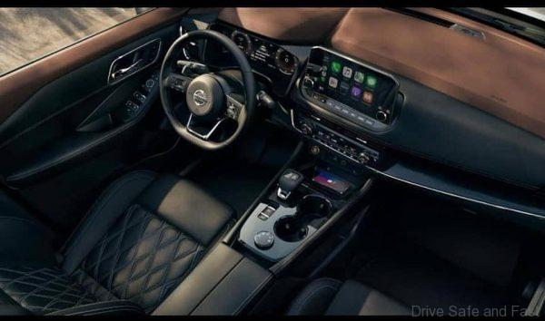 Interior photos show a dual-tone dashboard with wood trim, what looks like an electronic gear shifter, Wireless Qi charging, a rotary dial for drive modes, electronic parking brake with auto hold (already a feature on the current X-Trail), fully digitial instrument cluster and a rather large Apple Carplay enabled infotainment unit with a taller aspect ratio.