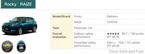 The Japanese New Car Assessment Program (JNCAP) gave the Toyota Raize a 5-Star Safety Rating.