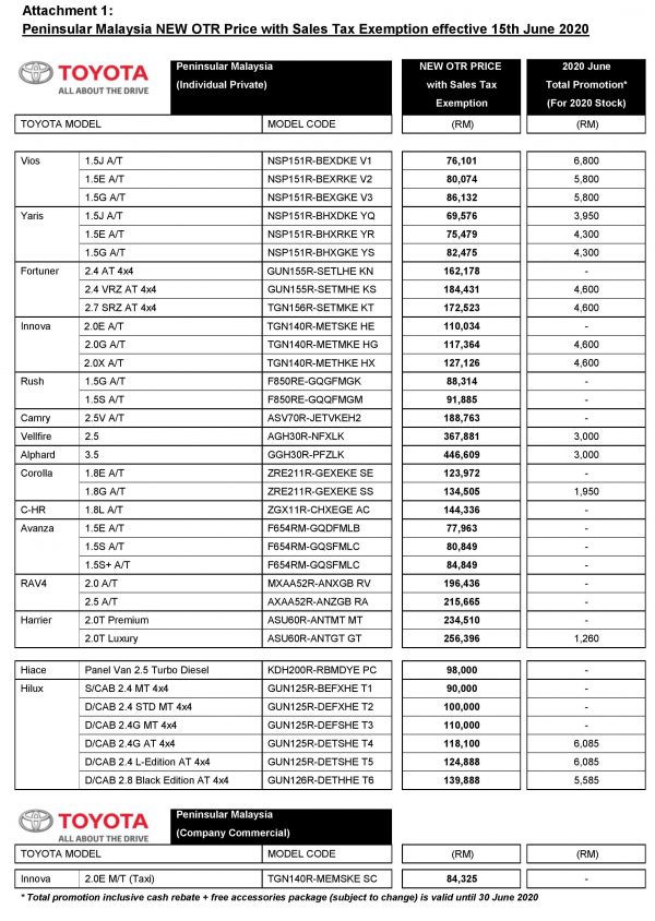 UMW Toyota Motor has announced new prices for Toyota and Lexus vehicles, following the government’s announcement to exempt sales tax on locally-built and fully-imported models.