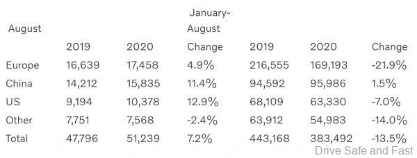 In China, sales reached 15,835 cars, up 11.4 per cent compared with August last year. In the first eight months of the year, sales grew by 1.5 per cent, compared with the same period last year.