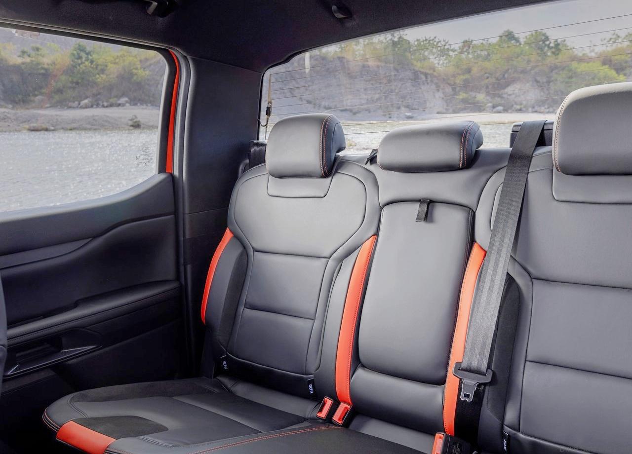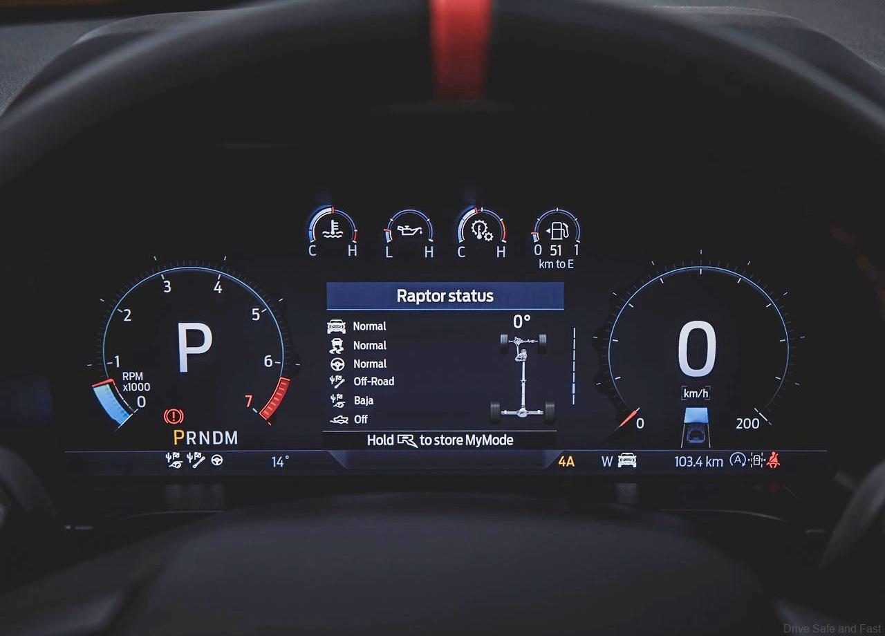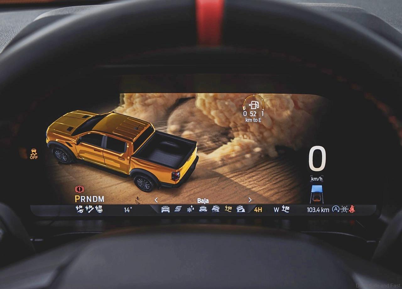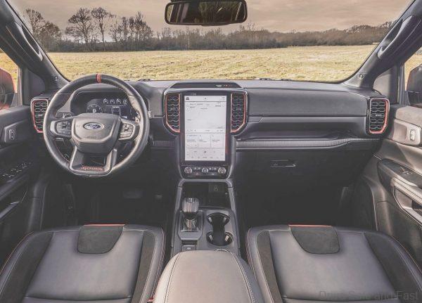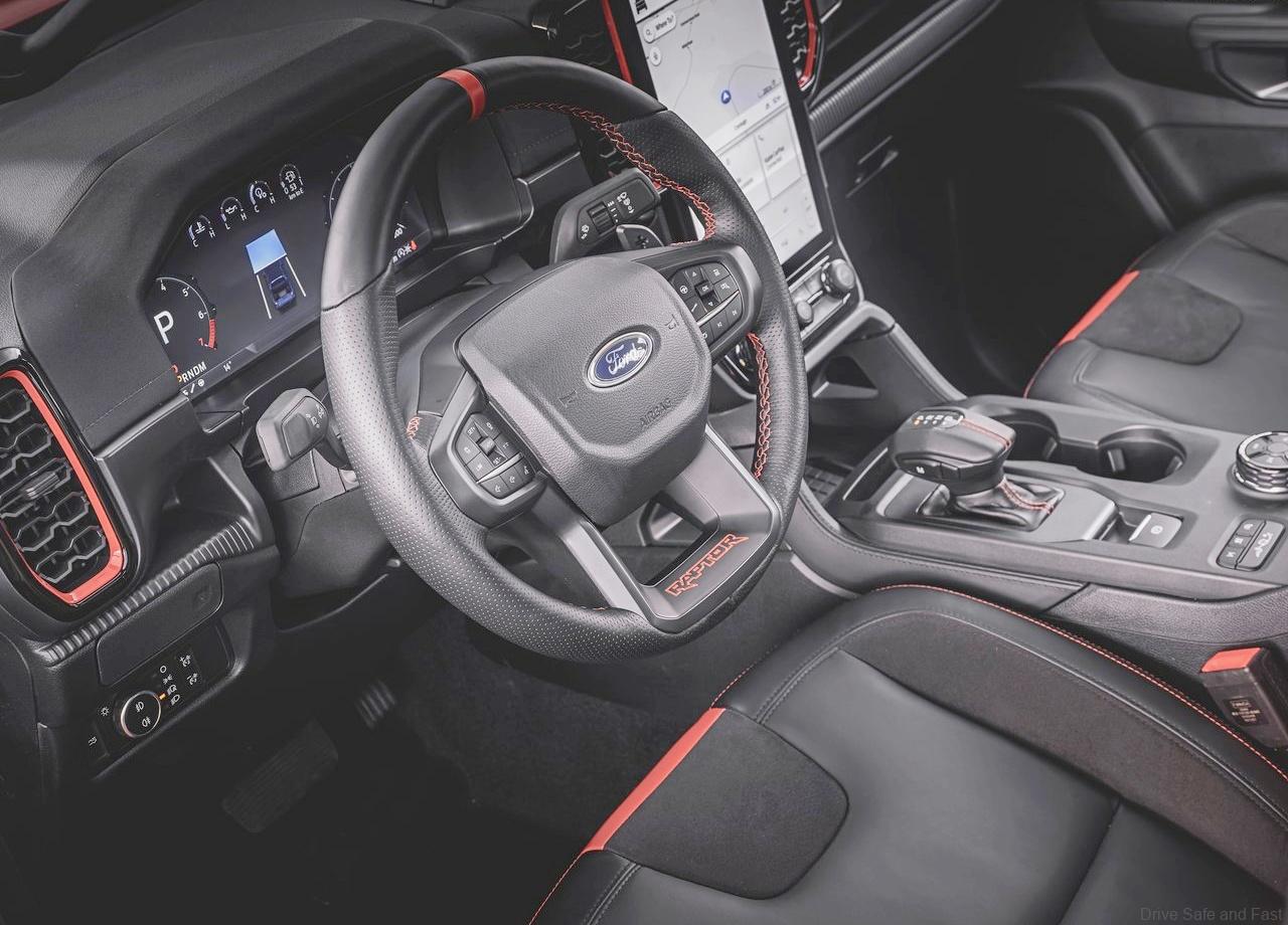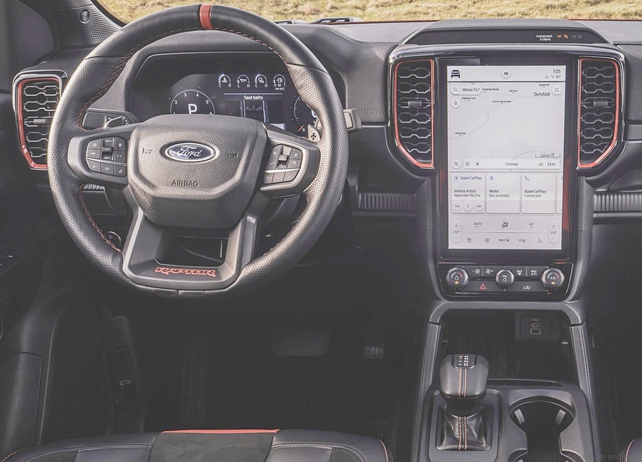 Inside, the Ranger Raptor has jet plane inspired sport seats, Code Orange accents on the instrument panel, trim, seats and more. Also present is a leather sports steering with thumb swell and centre marking flanked by magnesium paddle shifters.