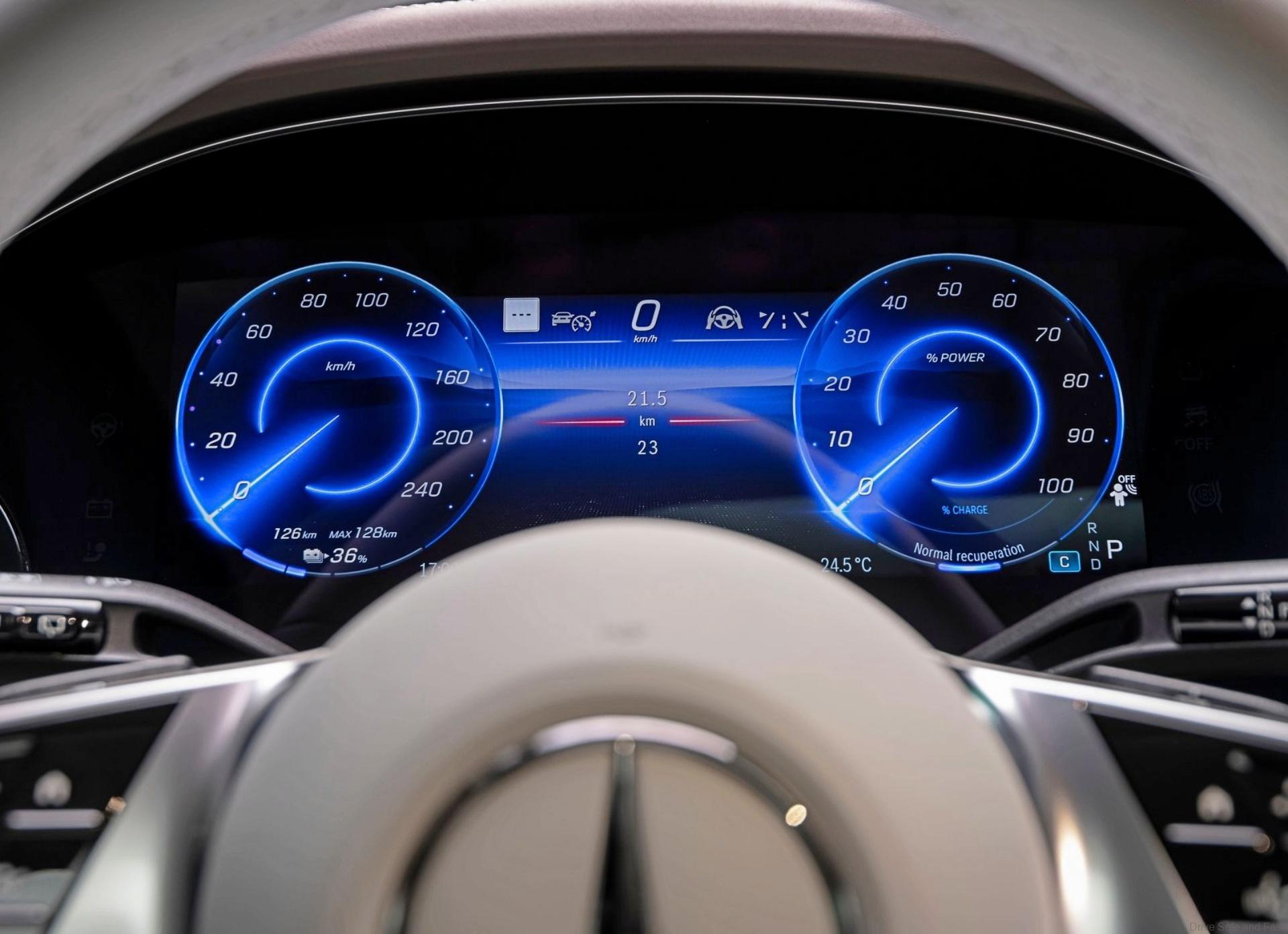 The functional content and the operating structure are adapted to electric driving. Visually, all graphics are designed in a new color scheme of blue/orange throughout. The classic cockpit display of the two round dials has been reinterpreted with a digital light sabre in a glass lens. All content relevant to driving can be accessed between the round dials.