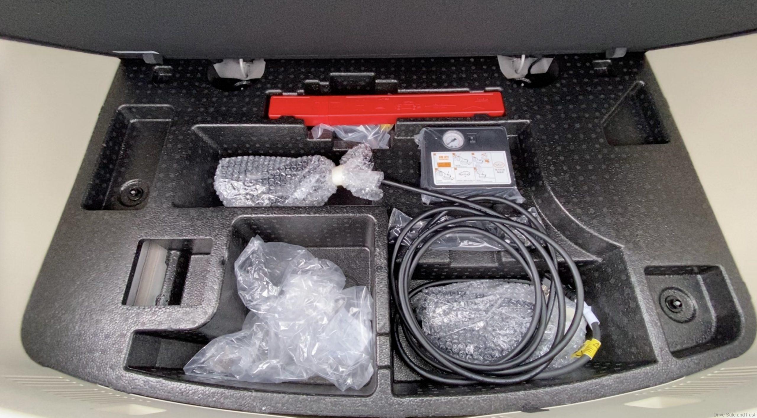 There are 2 USB-A ports up front and 1 in the rear. The rear seats can accommodate 3 and they fold in a 60:40 split with a small height difference with the boot floor. Charging cables and elements of the emergency kit are neatly stored under the boot floor.