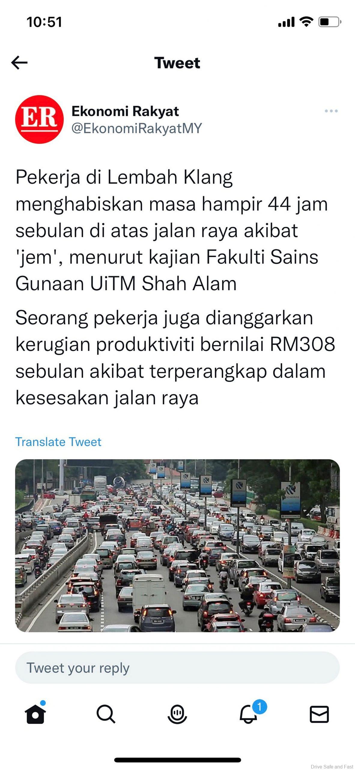 The tweet, from Ekonomi Rakyat, roughly translated, reads “employees in the Klang Valley spend almost 44 hours a month on the highway due to traffic jams according to a study done by the Faculty of Applied Sciences of UiTM Shah Alam. Each employee is also estimated to experience a loss in productivity equivalent to RM308 every month as a result of being stuck on busy highways.”
