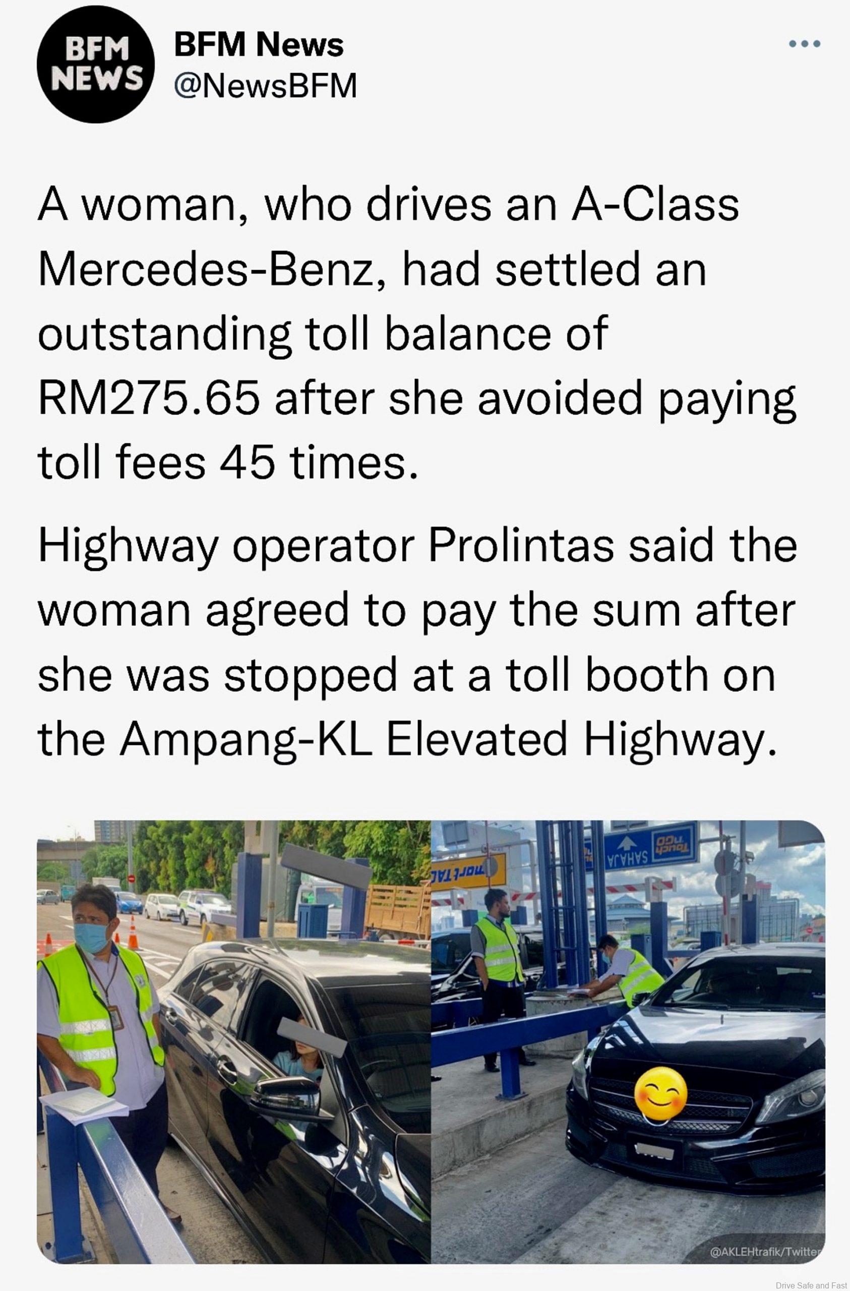 Moreover, BFM tweeted about the incident today and it read “A woman, who drives an A-Class Mercedes-Benz, had settled an outstanding toll balance of RM275.65 after she avoided paying toll fees 45 times. Highway operator Prolintas said the woman agreed to pay the sum after she was stopped at a toll booth on the Ampang-KL Elevated Highway.”