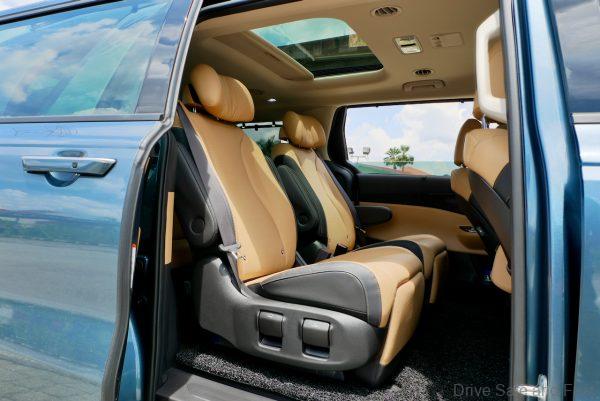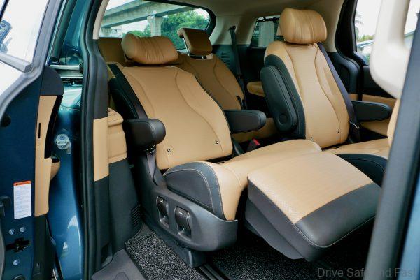 First of all, those 2 seats in the middle of this trim, they’re not regular seats. They’re Kia’s Relaxion ventilated ‘captain’ seats with individual armrests, extendable thigh support and they’re fully reclinable for the business class experience. Some adjustments must be made manually, but common adjustments are electrically powered. This is also the only Carnival variant that uses genuine leather for some of the seats covers.