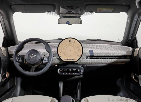 Inside, the new MINI has been reduced to essentials. There’s a curved dashboard that’s covered in textile surfaces and flat air vents. Everything centres around a central circular OLED display running MINI Operating System 9.