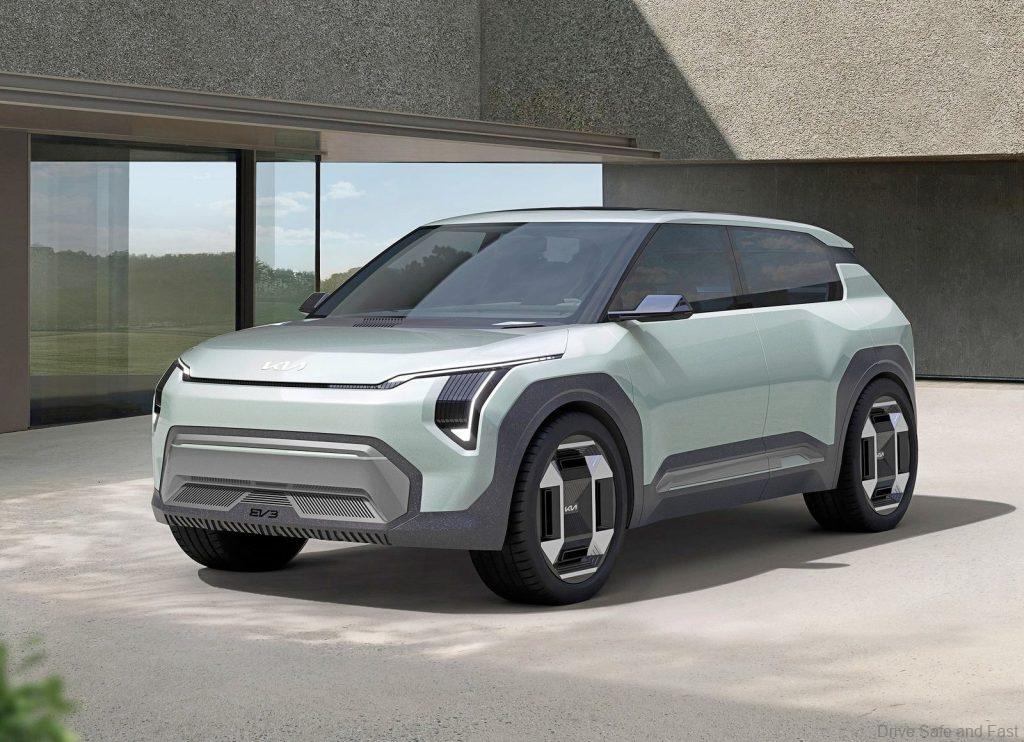 Kia shows their range of small to medium sized electric vehicles – the EV3 Concept, EV4 Concept and EV5.