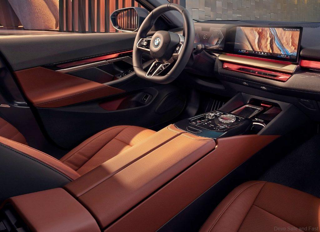 Inside, the 5 Series and BMW i5 LWB models get the BMW Curved Display, redesigned steering wheel, the BMW Interaction Bar, BMW iDrive with “QuickSelect”, Crafted Clarity glass application, Titanium Bronze inlays, BMW Theater Screen, Bowers & Wilkins Diamond Surround Sound System and 4-zone automatic climate control. The 5-Series logo is also embossed into the headrests while the seat surfaces get exclusive quilting and a bicolour design.