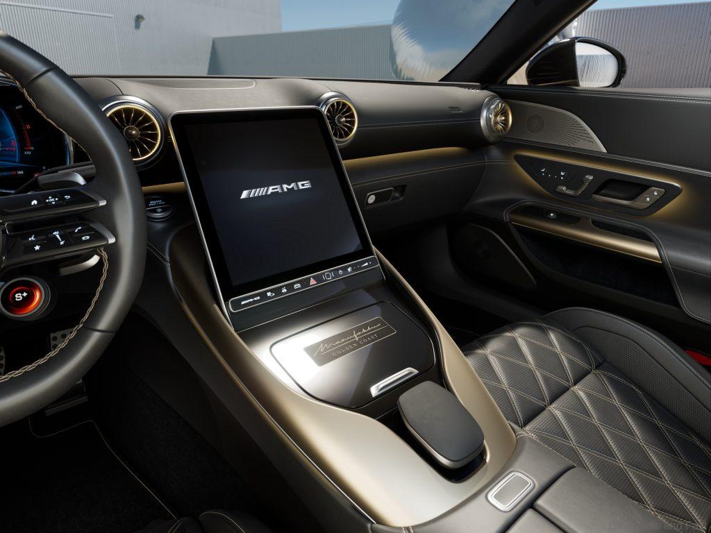 Stepping inside reveals an equally indulgent cabin inspired by the exterior colour scheme. The AMG Performance seats feature diamond-quilted black Nappa leather with contrasting golden topstitching.