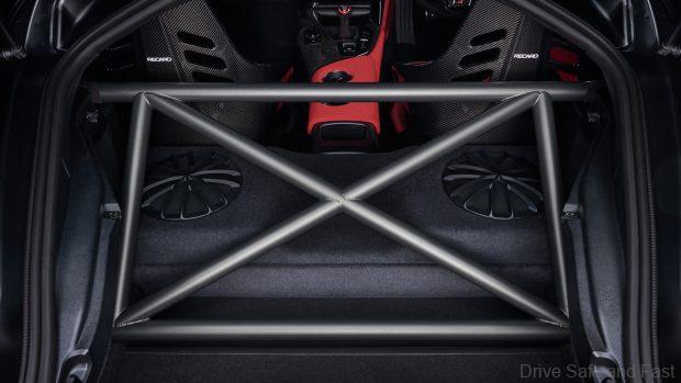 • Red seatbelts and exclusive carbon-fiber scuff plates emphasize the model’s exclusivity.