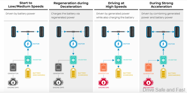 This is e-POWER technology from Nissan Japan and it takes away driving range anxiety, the need to use an app to book a battery charger and the worry that a long wait is needed while the battery gets charged. e-POWER vehicles are essentially electric cars (EV) with an onboard petrol fed generator for battery self-charging.