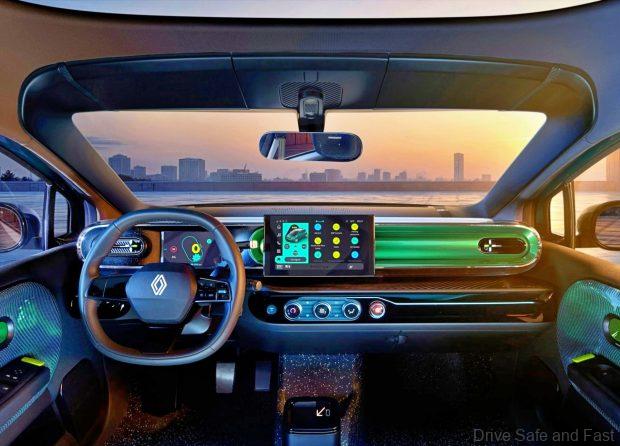 The dashboard features a suspended, cylindrical design that creates an airy feel while incorporating essential modern technology. A 7-inch digital instrument panel and 10.1-inch central multimedia screen provide connectivity and entertainment, featuring unique graphics that enhance the dynamic driving experience. The iconic red hazard warning light button, housed in a translucent bubble, serves as a deliberate throwback to the original Twingo’s interior styling.