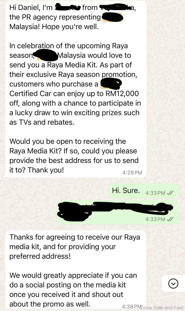 The PR firm contacts us to get our home address to say a Hari Raya package is being sent to us. We explain that we are not celebrating Hari Raya and instead we celebrate Christmas.