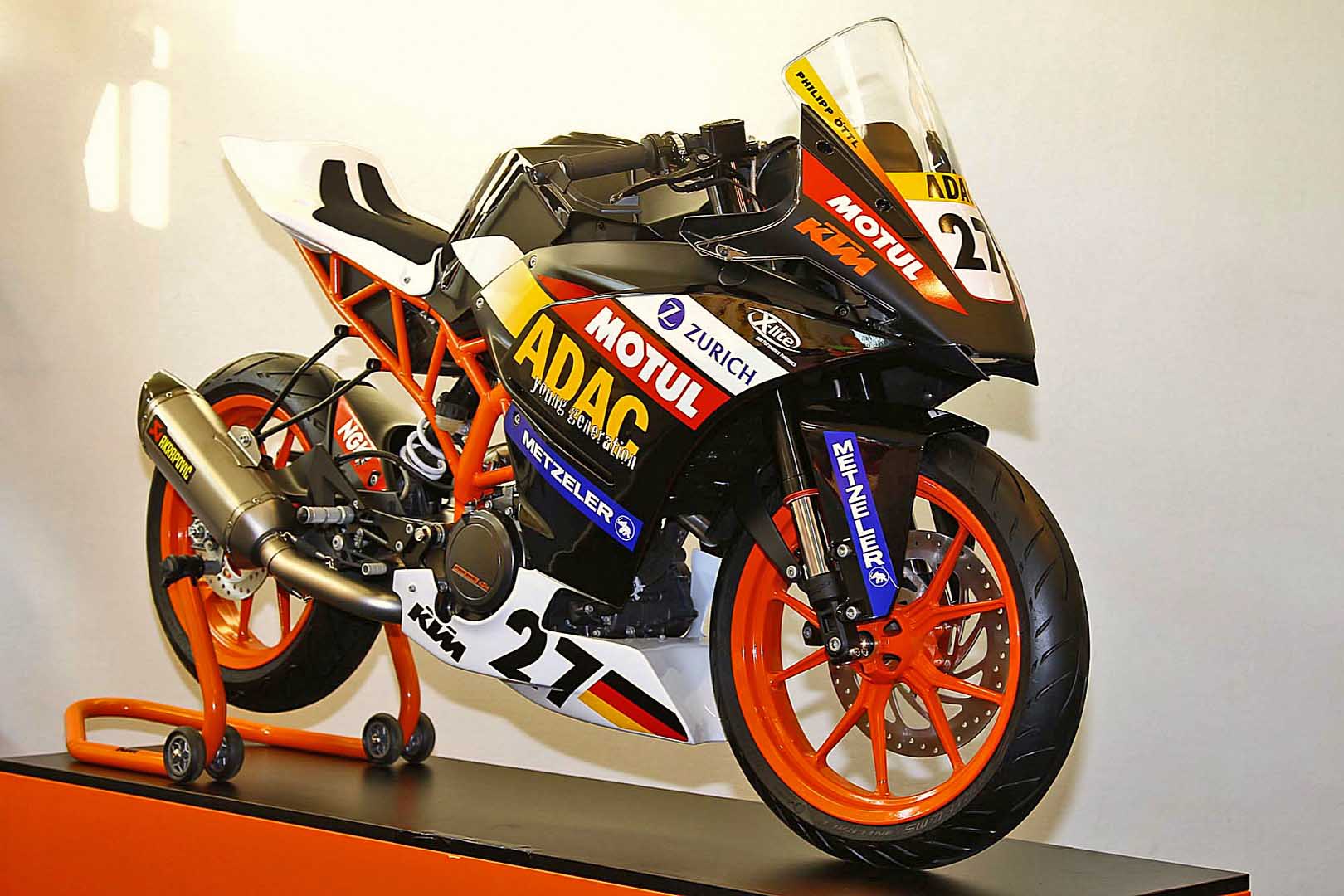 The Duke has a claimed tank-empty weight of 306 pounds and claimed hp is 43 (expect a little under 40 at the wheel). The RC390 is the Duke with different styling, including that angular, Gerald Kiska-penned fairing. The race version is trimmed down to 286 pounds and less than 39 hp, but this is due to racing rules.