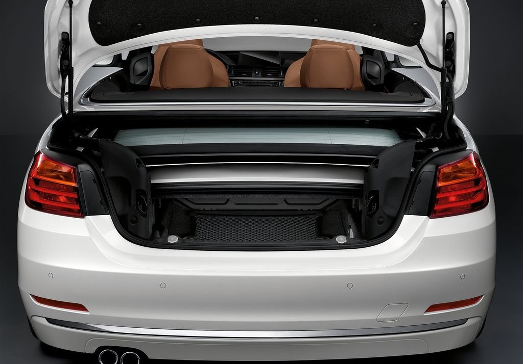 The BMW 4-Series Convertible also has plenty of space in the boot, even when the retractable hardtop is lowered: Unlike earlier models, the new convertible offers wider access to the luggage compartment, and an electro-hydraulic loading assistance system pivots and positions the folded hardtop in the boot as needed to ensure maximum utilisation of the 220 litres of storage space available. The loading assistance feature makes sure that there is always ample access to the boot whether the top is up or down. But that is not all: Two storage compartments on the right and left of the main luggage area are also available for stowing small items when the retractable top is closed. When the top is up, the luggage compartment has a volume of 370 litres – that is 20 litres more than available in the BMW 3-Series Convertible.