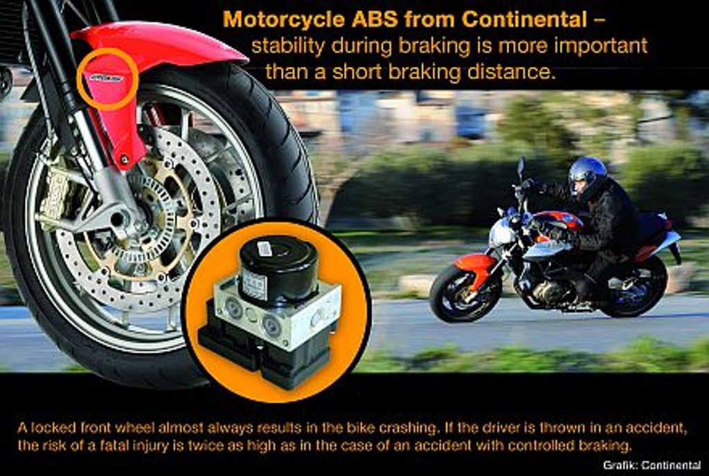 Just as for passenger cars, anti-lock brake systems are important for motorcycles to ensure that the vehicle remains stable when slamming on the brakes and that the front wheel does not lock, thus preventing uncontrolled skidding.