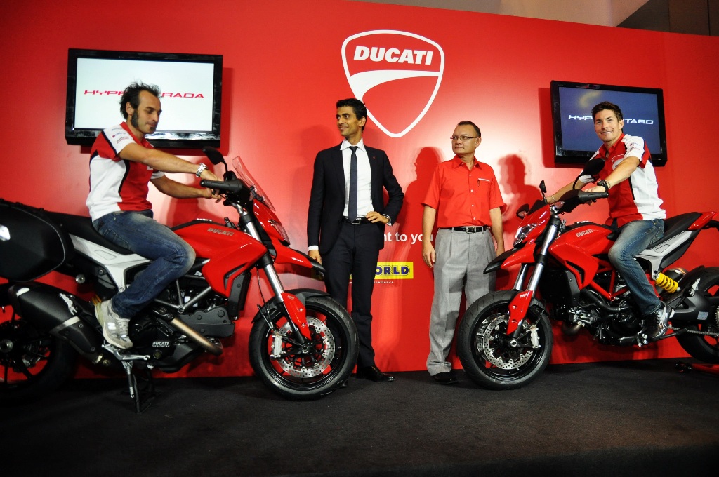 The 2013 editions of Ducati’s Hypermotard and Hyperstrada models were launched in Pavilion Kuala Lumpur today, with Ducati team rider and MotoGP World Champion (2006), Nicky Hayden, present to mark the occasion. Attending the launch were Mr. Pierfrancesco Scalzo, Ducati Region Asia Commercial Director, Mr. Nik Danial Nik Mahmood, Vice President of NAZA Two Wheel Division, Mr. Paolo Ciabatti, Ducati MotoGP Project Director, Mr. Vittoriana Guareschi, Ducati Corse Team Manager and Mr. Nageb Abdul Majid, President of Ducati Club Malaysia.