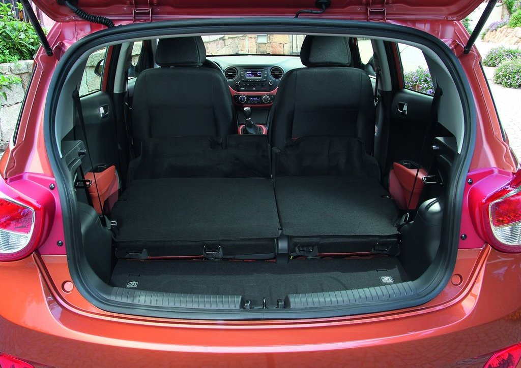 Trunk capacity is boosted by 12% to a class-leading 252 litres (a 27-litre increase over its predecessor), easily accessed by a tailgate that opens to within just 724 mm of the ground. The rear seats fold 60:40, yielding a useful 1046 litres of storage space, accessed by one of the widest trunk openings (920 mm) in the A-segment. Uniquely for an A-segment car, all four doors can each hold a large-capacity bottle (1,0-litre size in the front doors; 0,6-litre in the rear doors); drinks holders positioned immediately rearward of the gear lever further boost i10’s functionality.