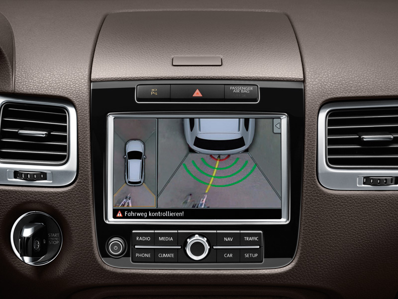 Four miniature digital cameras (in the front and rear, and on the outside rearview mirrors), linked to an image processing application, allow the system to display a single homogeneous view on a central screen. The processed image gives the driver the impression of seeing the vehicle and its environment from above (almost like he or she is looking down on the Touareg). Maneuvering in complex situations becomes safe and easy.
