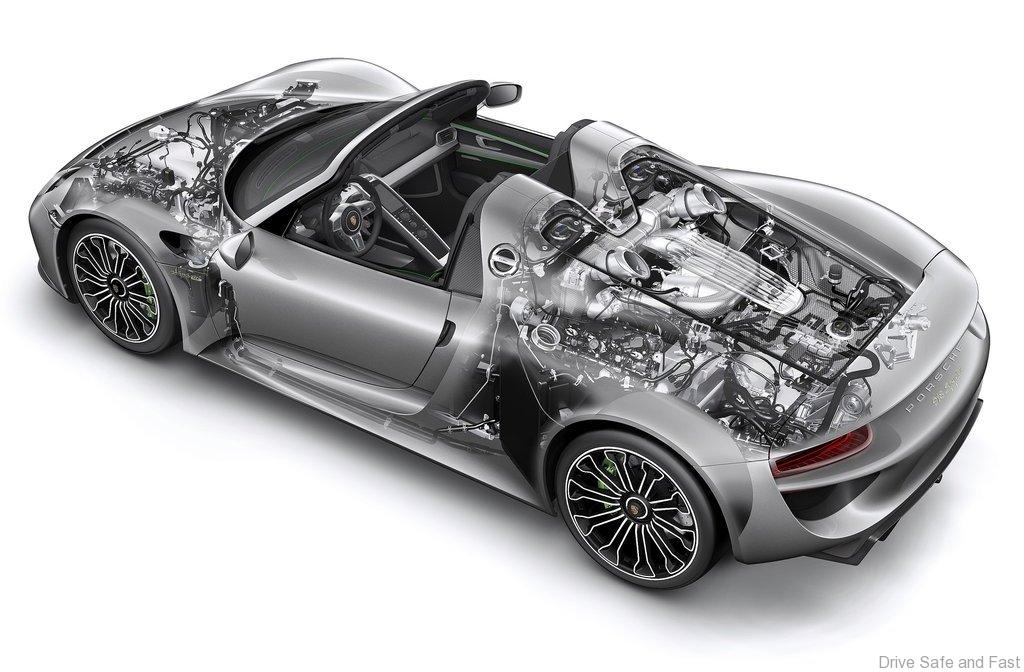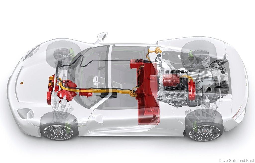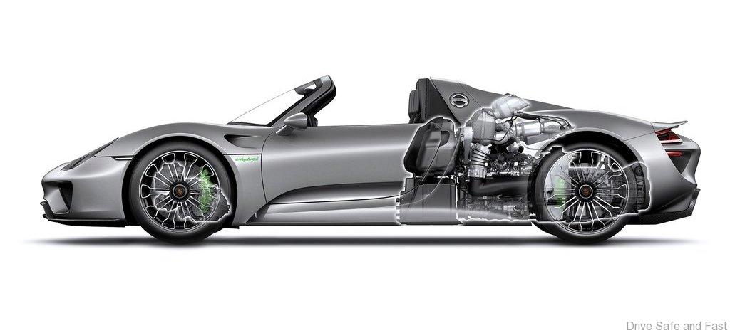 The V8 engine is coupled to the hybrid module as the Porsche 918 Spyder is designed as a parallel hybrid like Porsche’s current hybrid models. The hybrid module essentially comprises a 115-kW electric motor and a decoupler that serves as the connection with the combustion engine. Because of its parallel hybrid configuration, the 918 Spyder can be powered at the rear axle either individually by the combustion engine or the electric motor, or via both drives together. As is typical for a Porsche super sportscar, the power unit assembly in the 918 Spyder has been placed in front of the rear axle, and it does not have a direct mechanical connection to the front axle. A seven-speed Porsche Doppelkupplung (PDK) transmission handles power transmission to the rear axle.