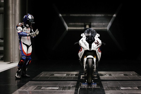 Straight after the race weekend at Dutch track, Assen, BMW Motorrad factory rider Chaz Davies (GBR) flew directly to Munich (GER). There, the factory rider of the BMW Motorrad GoldBet SBK Team spent the afternoon in the wind tunnel of the BMW Group. With the next round of the 2013 FIM Superbike World Championship being held at Monza (ITA), Chaz worked on aerodynamically optimising his riding position on his BMW S 1000 RR. This is the same process that his team mate Marco Melandri (ITA) completed last year when he rode his first season on the RR. With simulated speeds up to 240 km/h, Chaz, who stands at 1.83 metres tall, tried several different positions and body angles in order to find the ones that minimise the drag as much