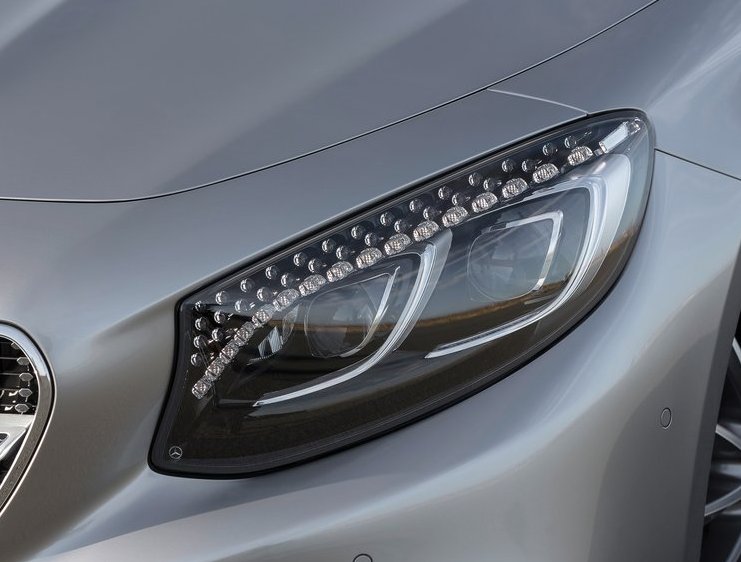 The full-LED headlamps with their iconic eyebrows as daytime running lamps lend it an extremely self-assured and distinctive gaze. On the S-Class Coupé the eyebrows have been further refined with a semi-circular counter-curve. In combination with the standard LED Intelligent Light System, unique headlamps with no less than 47 Swarovski crystals are available. 17 angular crystals form the flare-shaped daytime running lamps, with 30 round-shaped crystals making up the turn indicator lamps.