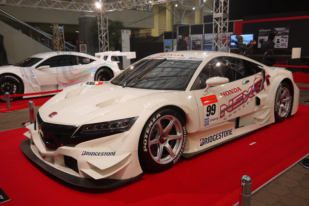 Visitors took a closer look at the powerful brave figures of three new GT500 racing cars, “LEXUS RC F,” “HONDA NSX CONCPET-GT,” and “NISSAN GT-R NISMO GT500,”which will debut in the competition from this season, displayed up front at the main entrance.