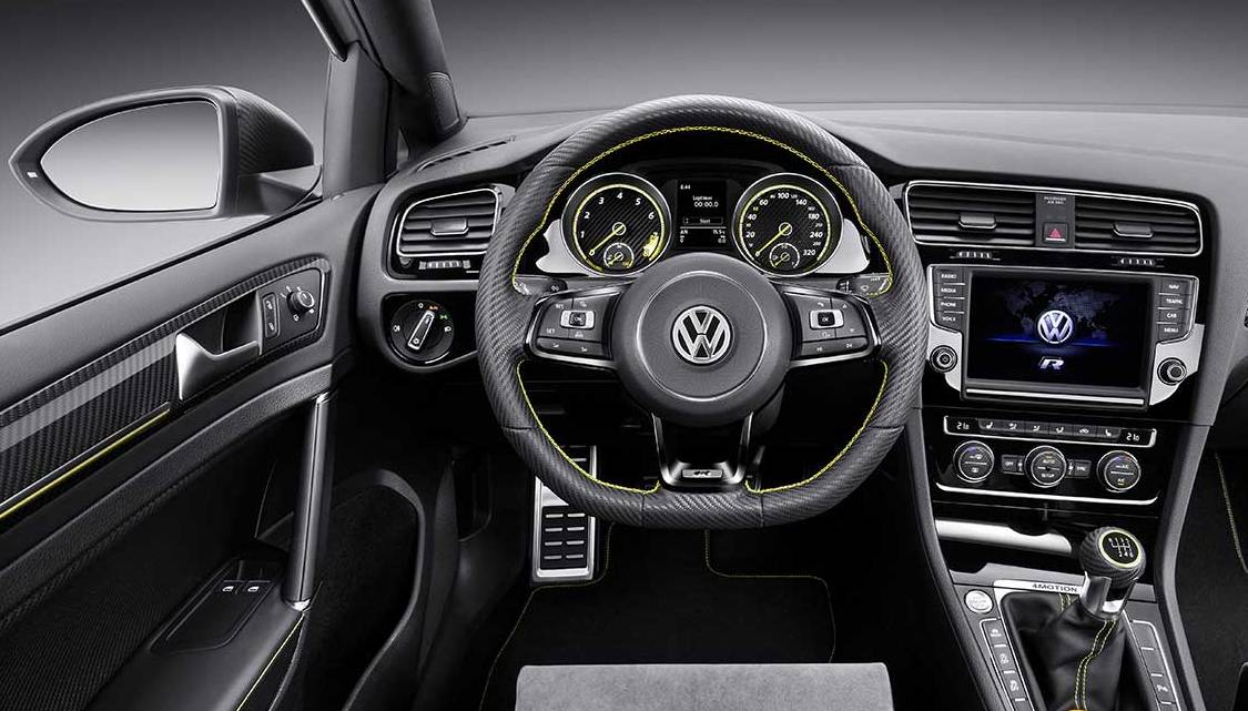 The redesigned rear bumper includes vents on each side, and the Golf R’s four tailpipes have been replaced with two centrally mounted items, like those on the 2002 Golf R32. These 110 mm diameter items are 200 mm apart, and point slightly upwards, displaying a honeycomb mesh. A black double spoiler with LED brake lights atop the tailgate finishes the look.