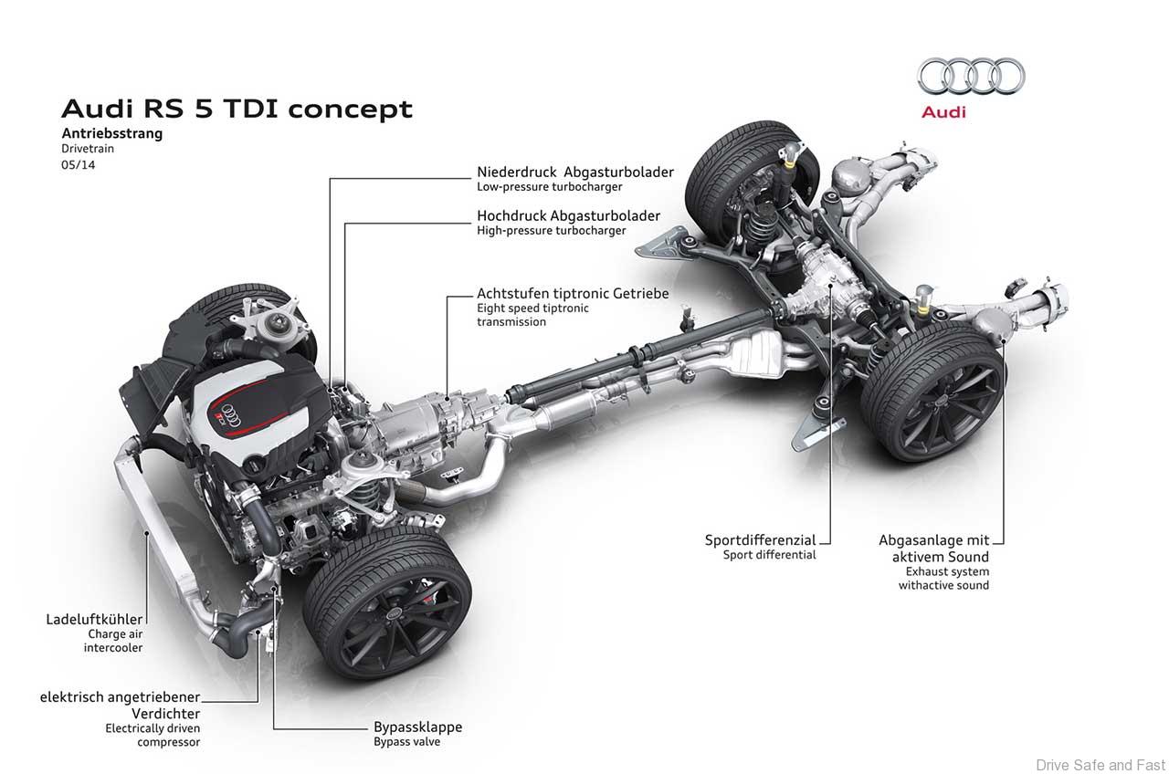 This is the first-even diesel-powered RS model from Audi and it is expected to go into production next year. This new engine uses a two-stage turbocharger: a smaller turbo that is lighter and gives the engine more grunt at lower engine speeds, while the bigger turbo starts spinning at higher speeds.