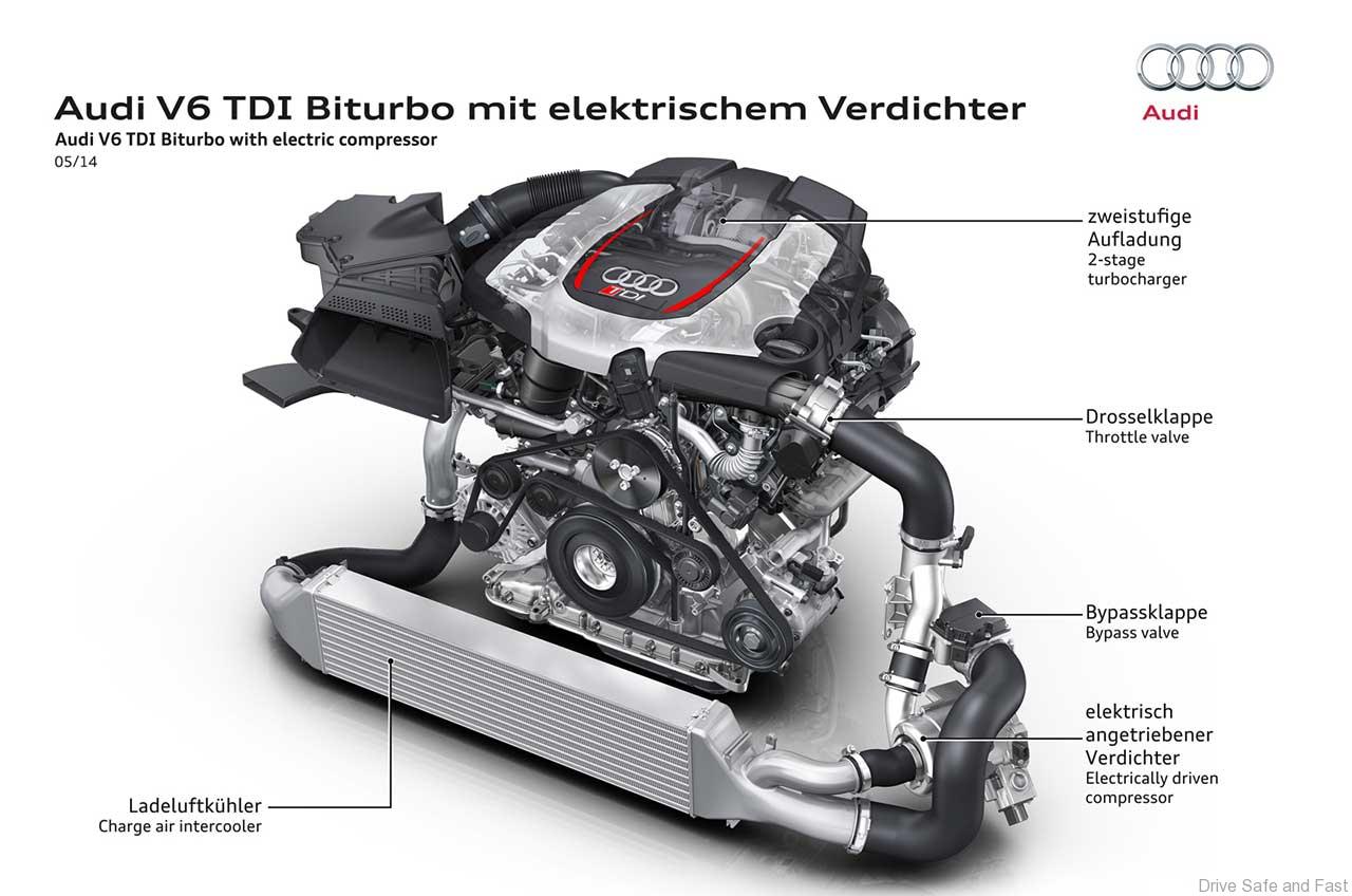 What’s more interesting is that the engine uses electrical assistance to be sure that the smaller turbocharger is spinning quickly enough to be active at very low engine speeds. This means that the V6 TDI BiTurbo diesel engine comes fitted with an electric compressor.