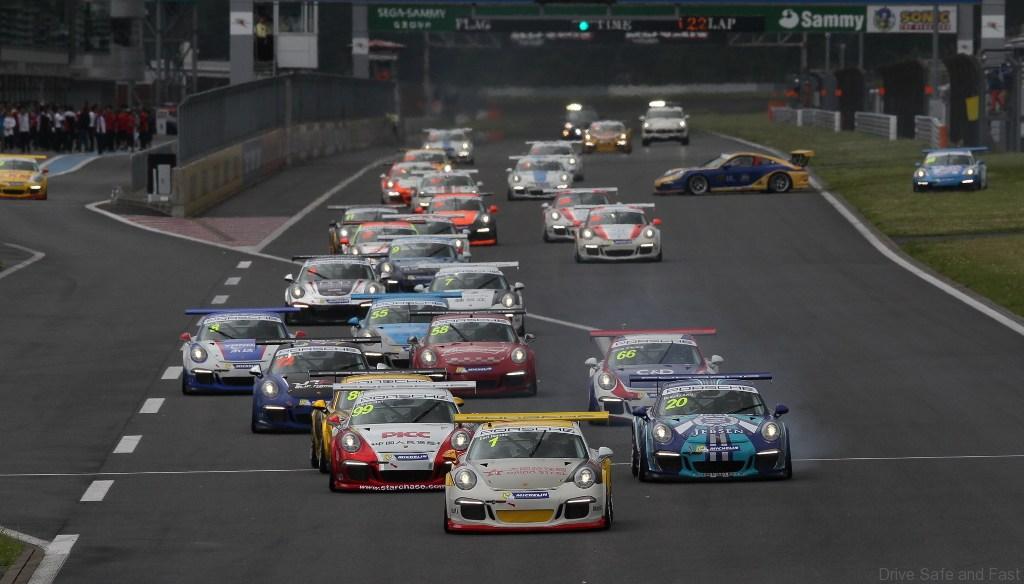 Then it was lights out and as the Porsche Carrera Cup Asia field roared off the grid for the first time in Japan, and it was defending champion Earl Bamber who led the field from pole. As he set about pulling away from the chasing pack, behind him several cars were caught up in the opening lap melee.
