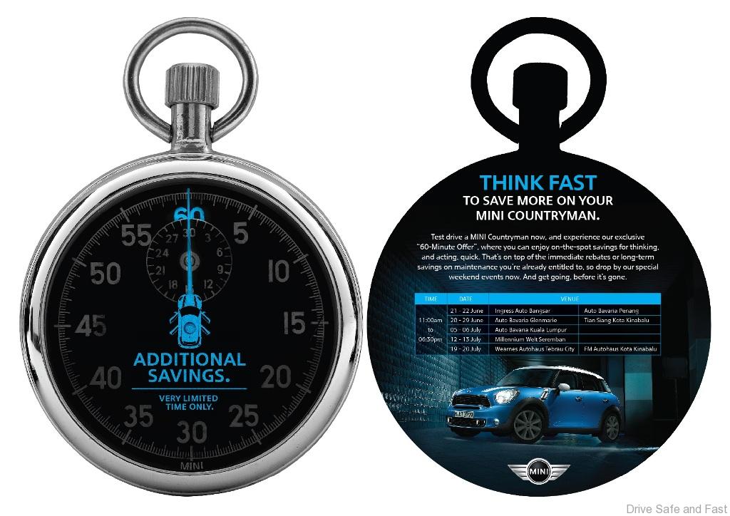 Come experience first-hand the EXCITEMENT behind the wheel of the MINI Countryman and participate in an exclusive “60-minute Offer” to enjoy on-the-spot savings. This is on top of the immediate rebates or long-term savings on maintenance MINI customers are already entitled to.