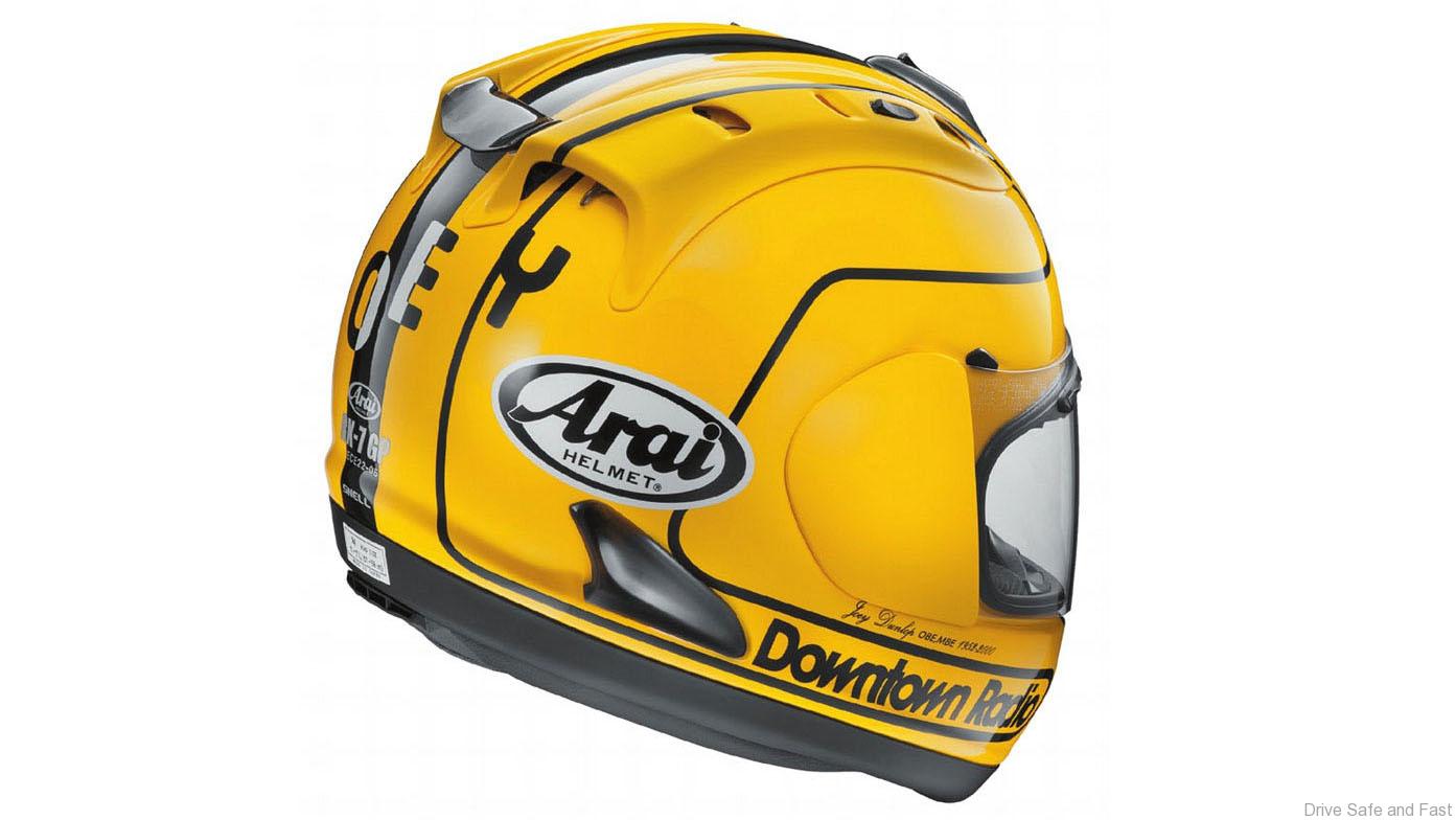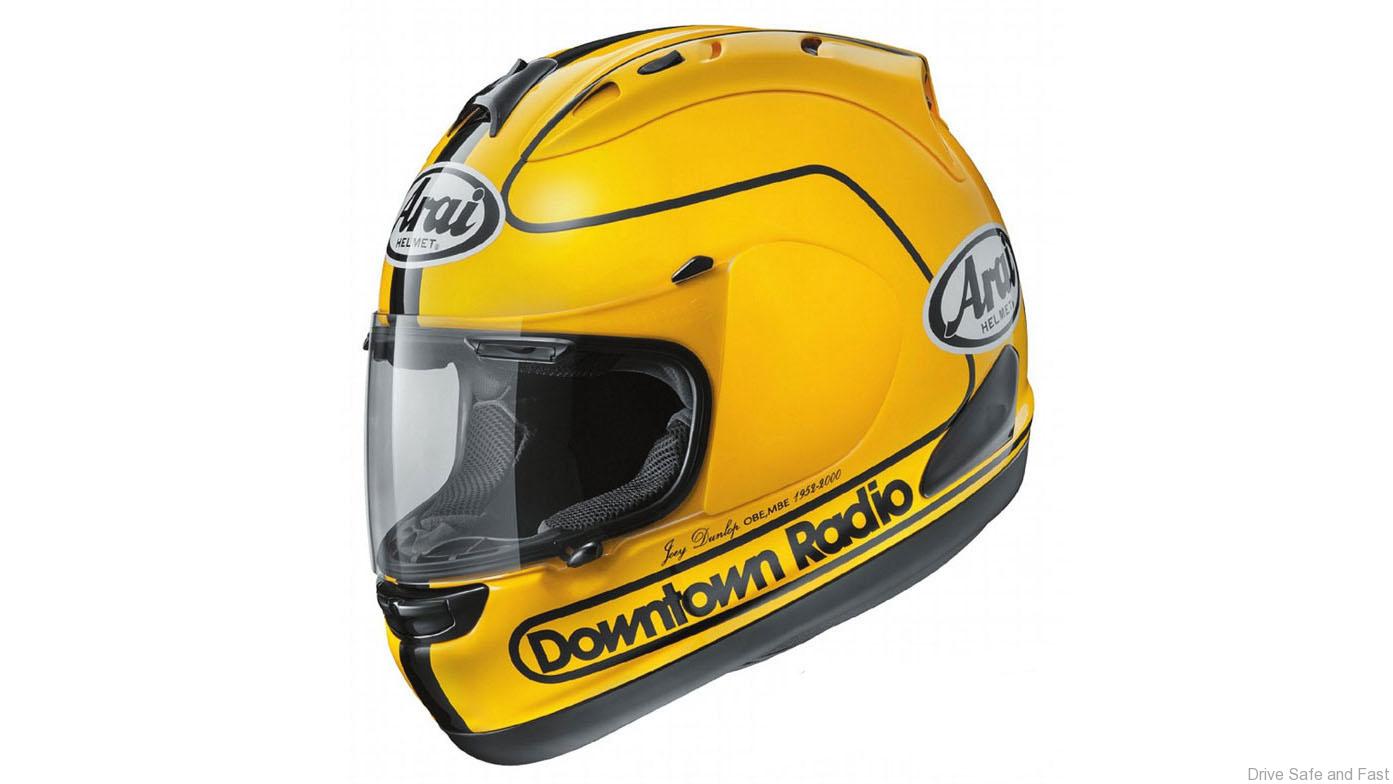 Joey Dunlop’s 1985 Arai helmet had the DownTown Radio sponsor stickers with the station’s logo on the side of the now legendary yellow/black design. DownTown Radio is still on air today, and the “Joey 85” Arai lid maintains all the graphic details of the retro helmet, being the most accurate replica to date.
