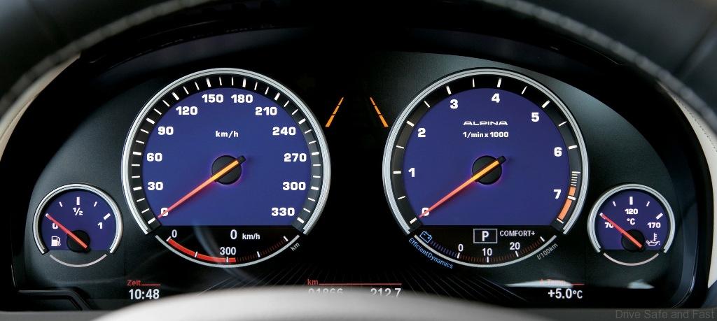 When taking seat in the B7 Bi-Turbo, one immediately takes note of the ALPINA door sill trims which are finely illuminated in blue. The SWITCH-TRONIC steering wheel is hand-stitched in the finest, most comfortable LAVALINA leather. In the driver’s line of sight, red pointers over a field of blue dials grace the instrument cluster, where a Black- Panel LCD screen is responsible for communicating driver-important information.