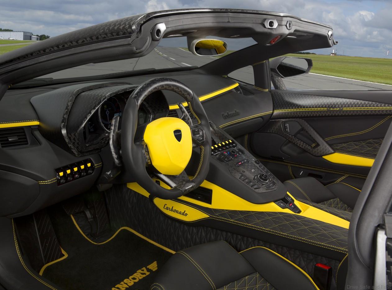 On the sides the striking side skirts and the larger wheel arches demonstrate the hand of the house of MANSORY. At the front the body has grown by 40 at the rear even by an impressive 50 millimetres in width. Also here looks and functionality go hand in hand. Because the new carbon components not only look diabolically good, they also act as air controller and even feed fresh air both to the unit under the new full carbon bonnet as well as to the rear braking system. The newly developed diffuser and the striking rear spoiler are responsible for perfect routing effect of the air flow underneath the vehicle. All of these technical improvements are necessary because the CARBONADO APERTOS significantly exceeds the performance figures of the series Aventador. MANSORY has namely rebuilt the V-engine with its 6.5 litres of displacement. Pistons, connecting rods, rod bearings, crankshaft, cranks and the entire cylinder head were replaced by the team of Kourosh Mansory with full-fledged motorsport components and at the same time two original MANSORY turbochargers were installed. In addition the CARBONADO APERTOS also received a completely new custom exhaust system from the engine to the stainless steel tail pipes on the rear. The result of this extensive rebuilding process is a boost in performance, which even the most demanding connoisseurs had not expected: from 700 hp (515 kW) MANSORY pushes the power output to a peak of an incredible 1,250 hp (920 kW). The maximum torque had to be electronically limited to 900 Newton metres by the engineering department. The all-wheel-drive sports car doesn’t need more than 2.6 seconds to sprint from zero to 100 km/h and only stops accelerating at 380 km/h. mansory_carbonado_roadster_3