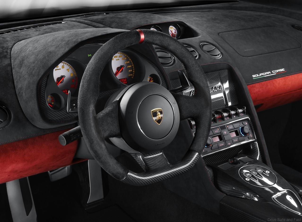 The Gallardo LP 570-4 Squadra Corse boasts a dry weight of 1340 kilograms, 70 less than the already lean Gallardo LP 560-4, which gives the Squadra Corse a stunning power-to-weight ratio of 2.35 kilograms per hp for breathtaking performance. It sprints from 0 to 100 km/h in a mere 3.4 seconds and reaches 200 km/h in just 10.4 seconds. Its forward thrust finally tops out at 320 Km/h. The production-standard carbon-ceramic brake system guarantees unmatched stopping power.