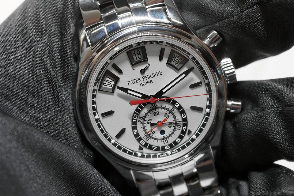 Black is also used for the faceted hour and minute hands (which are coated with Super-LumiNova), the 12-hour counter hand, and the power-reserve hand, and a bright signal red distinguishes the central chronograph seconds hand and the hand for the 60-minute counter. The model’s “monocounter” subdial has been reconfigured, with the 12-hour counter scale on the outside and the 0-to-30-minute and 30-to-60-minute scales in the middle and inside, respectively. Caliber CH 28-520 IRM QA 24, which is equipped with column wheel and disk clutch, also powers a day/night indicator at 6 o’clock. The Patek Philippe Annual Calendar Chronograph Ref. 5960/1A has a stainless steel bracelet with droplet-shaped links and a stainless steel fold-over clasp. The price is from USD54,000.