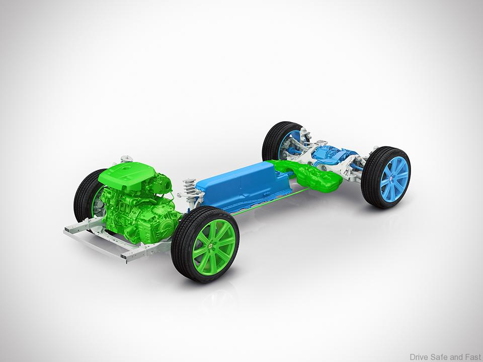 Normal driving is conducted in the default hybrid mode. This utilises a 2-litre, 4-cylinder supercharged and turbocharged Drive-E petrol engine that powers the front wheels and an 80 hp (60 kW) electric motor that drives the rear wheels. It uses the supercharger to fill in the bottom end of the power range to give the engine a big, naturally-aspirated feel, while the turbocharger kicks in when the airflow builds up. The electric motor on the rear wheels provides immediate torque.